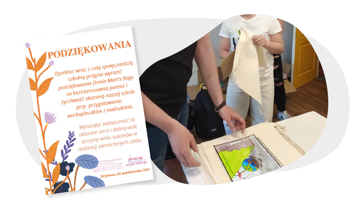 Cooperation with the School and Kindergarten Complex in Stryków has been a pleasure for us. We are happy to admire children's talents and see that they are used for good purposes. If you, too, would like to have cotton eco-bags with eco-prints (perhaps as prizes in some competition or as promotional materials?), please contact us!
