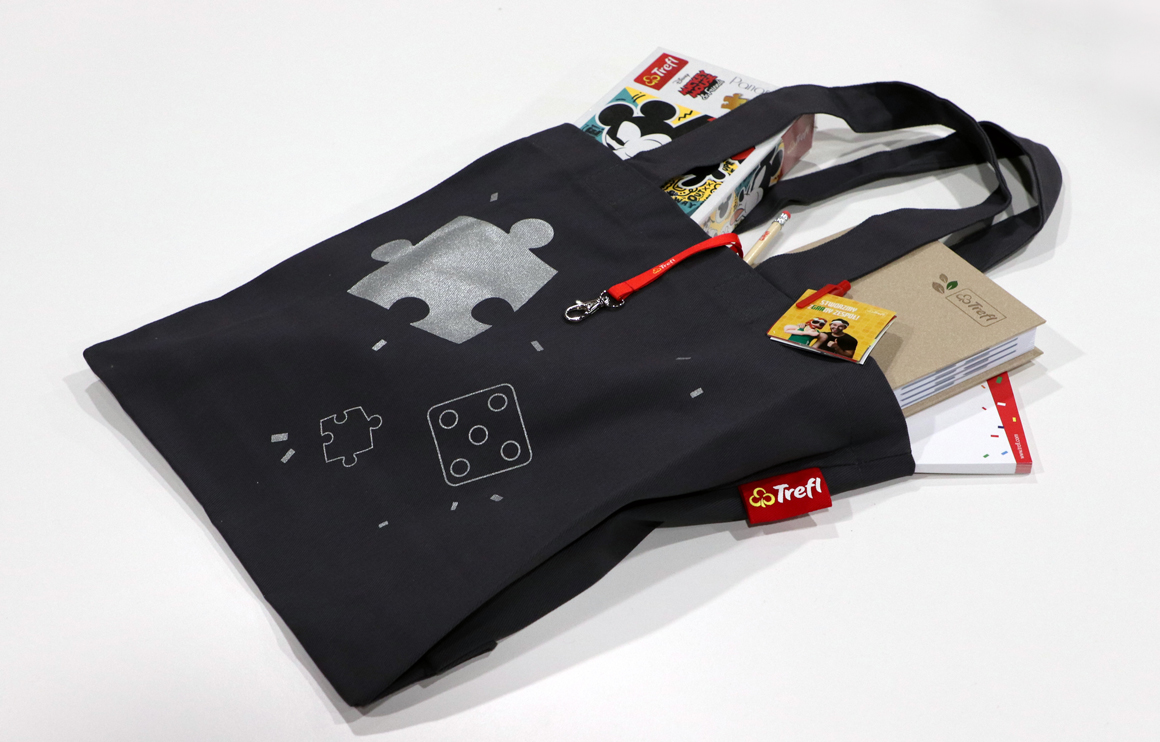 One of our clients is Trefl company. It is one of the most famous producers of board games, toys and puzzles in Poland. Especially for them, we have made a bag in a dark gray color and with patterns of their choice. The customer decided on a bag in the TM02 model, i.e. with the bottom and sides, pressed. The material used for the production of this bag is 280g canvas, which is a really firm fabric. The print was made in silver, adding the graphics a metallic gloss. A bag of this size is an excellent choice for a box with a board game.